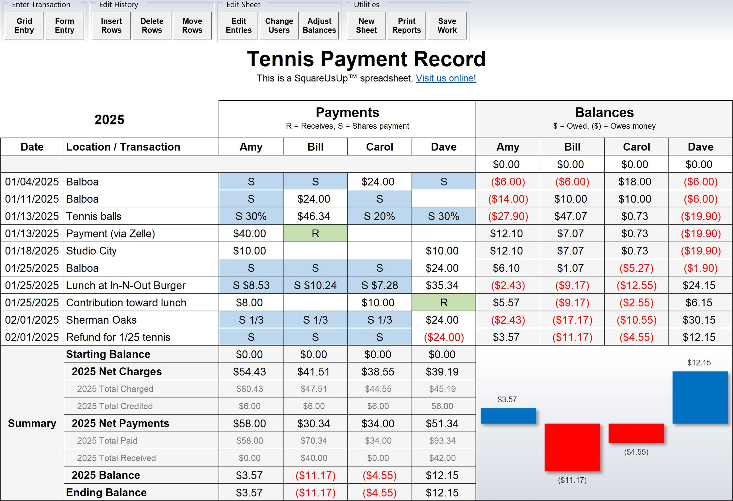 SquareUsUp handles just about any group expense-sharing situation imaginable. It is also so simple it can be learned in minutes. No other expense-sharing spreadsheet lets you do all this: